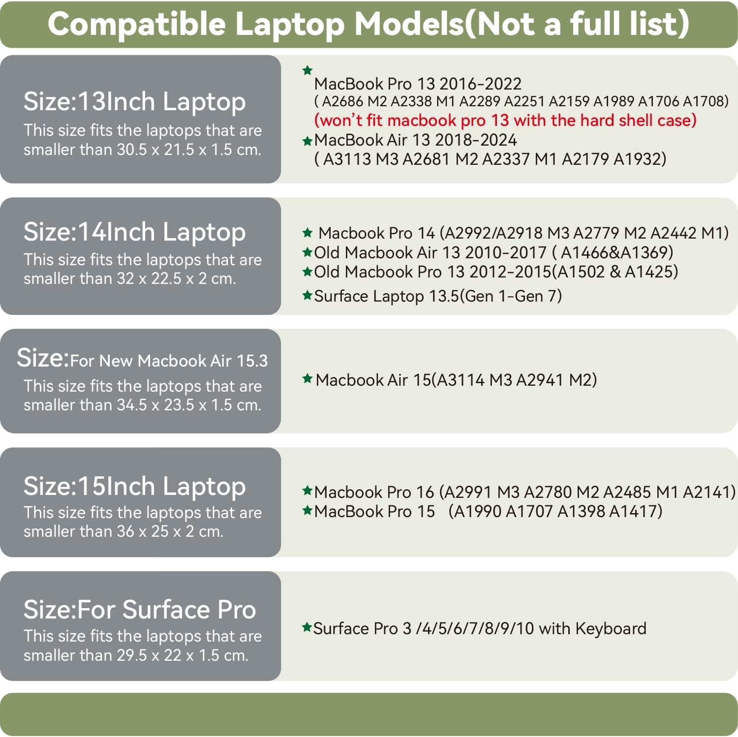 - Perfect Size: Our laptop sleeve is compatible with New Pro 13 2016-2022 ( A2686 M2 A2338 M1A2289 A2251 A2159 A1989 A1706 A1708), New 13 2018-2024 ( A3113 M3 A2681 M2 A2337 M1 A2179 A1932).Other laptops that are smaller than these dimensions-30.5×21.5×1.5 cm.If your laptops are too small than the above dimensions,then the sleeve will be a loose fit.If one of your laptop’s width,depth or height is larger ,then pls consider the next size